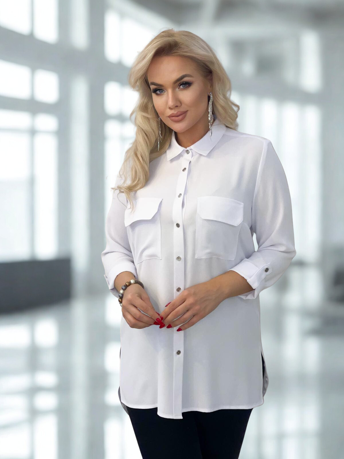 Długa, klasyczna koszula z kieszeniami i patkami na piersiach, której długość sięga poniżej linii bioder.
