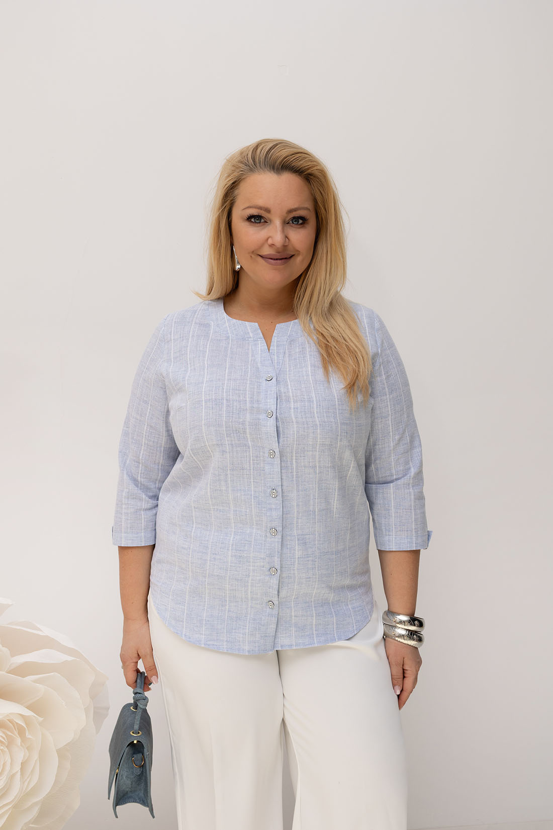 Bluzka posiada okrągły dekolt bez klasycznego kołnierzyka oraz listwę z guzikami. Zapięcie nie sięga do samej góry, dzięki czemu powstaje delikatny dekolt w kształcie litery V, który optycznie wysmukla sylwetkę.
