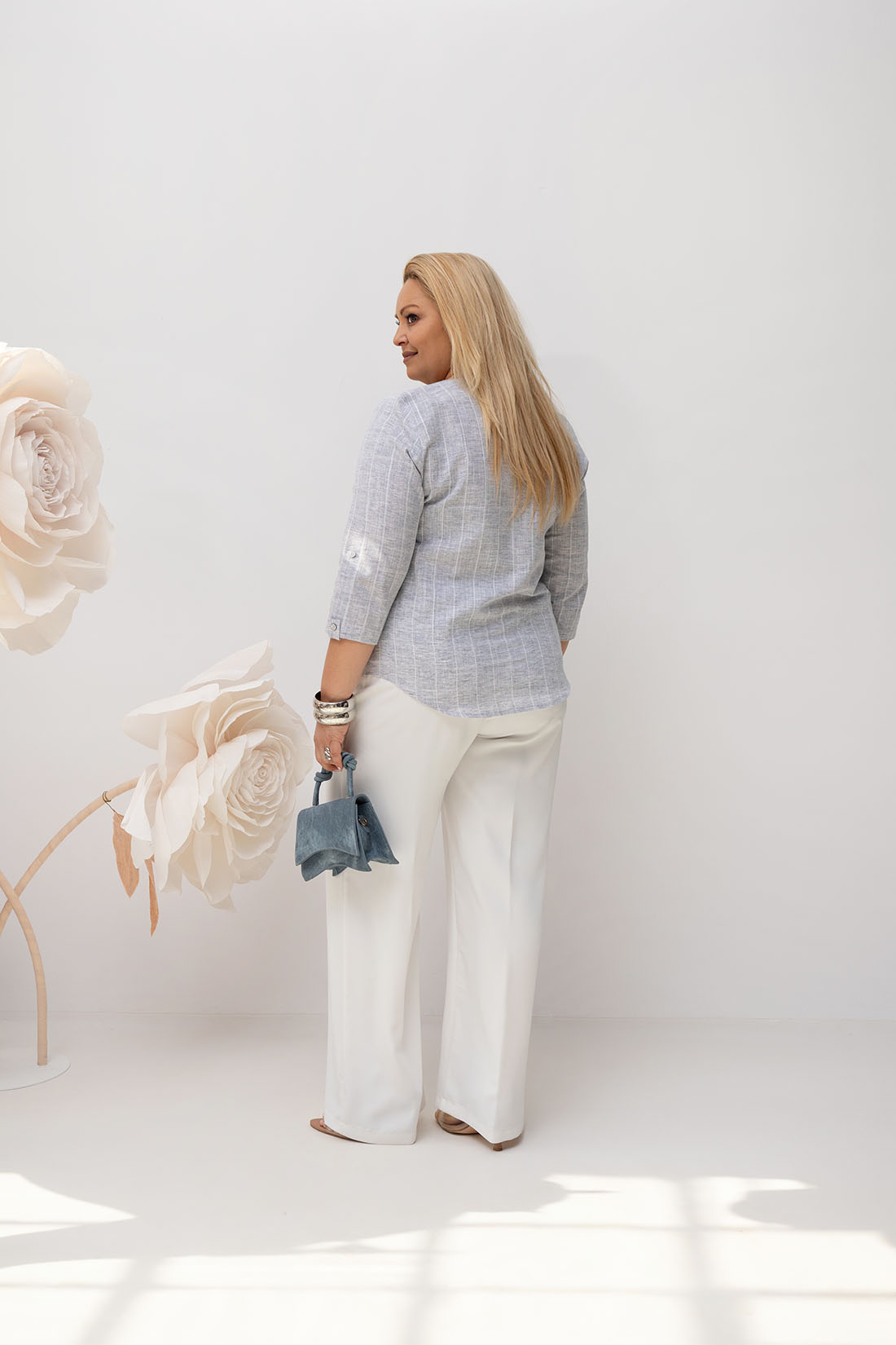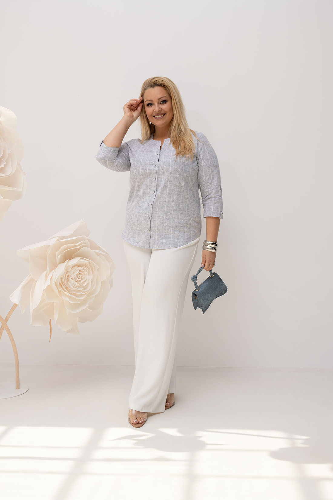 Bawełniana bluzka Elena plus size w melanżowej kratce to element garderoby, który sprawdzi się w wielu stylizacjach. Można ją nosić samodzielnie jako bluzkę lub rozpiętą jako lekką narzutkę na top. Pasuje do jeansów, letnich spodni czy spódnicy, idealna zarówno do pracy, jak i na co dzień.