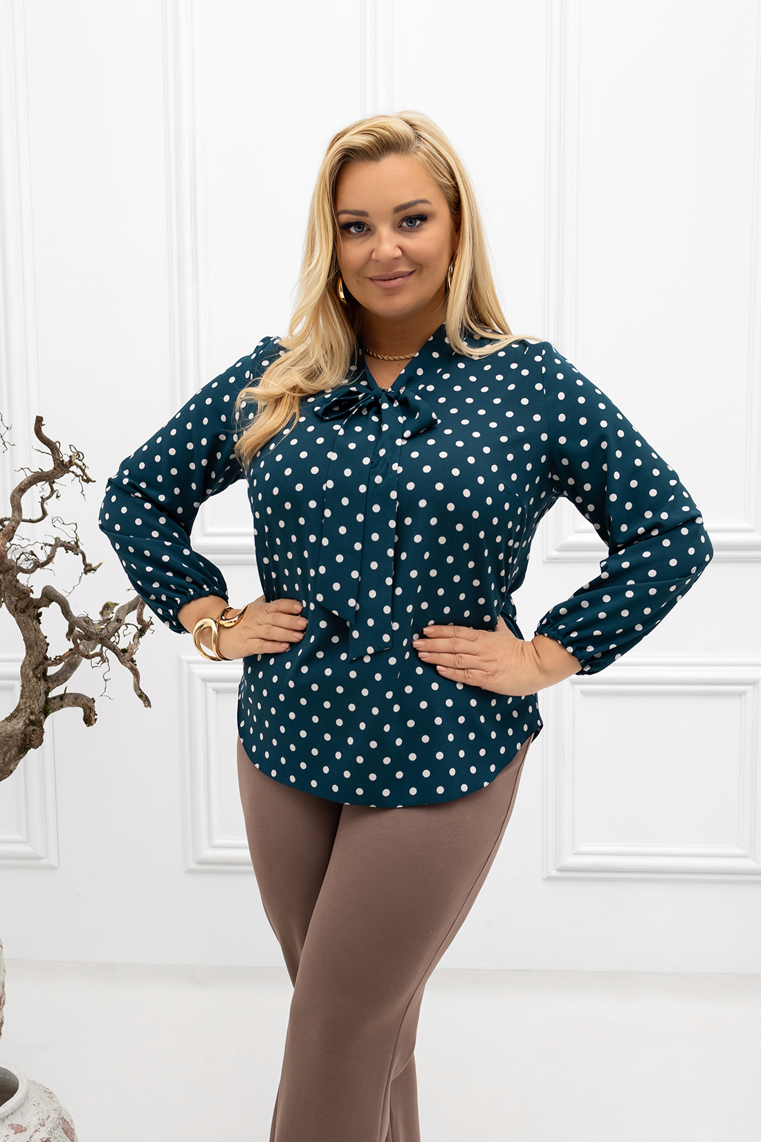 Elegancka bluzka z krawatką wiązaną w subtelną kokardę, dodającą szyku i kobiecego wdzięku. Model lekko taliowany, podkreślający sylwetkę, a jednocześnie zapewniający komfort noszenia. Świetnie sprawdzi się zarówno w formalnych stylizacjach, na przykład w połączeniu z marynarką i ołówkową spódnicą, jak i w codziennych zestawach z klasycznymi jeansami czy eleganckimi spodniami. Delikatna krawatka stanowi ozdobny akcent, a ponadczasowy fason bluzki zapewnia uniwersalność, czyniąc ją idealnym wyborem na każdą okazję.