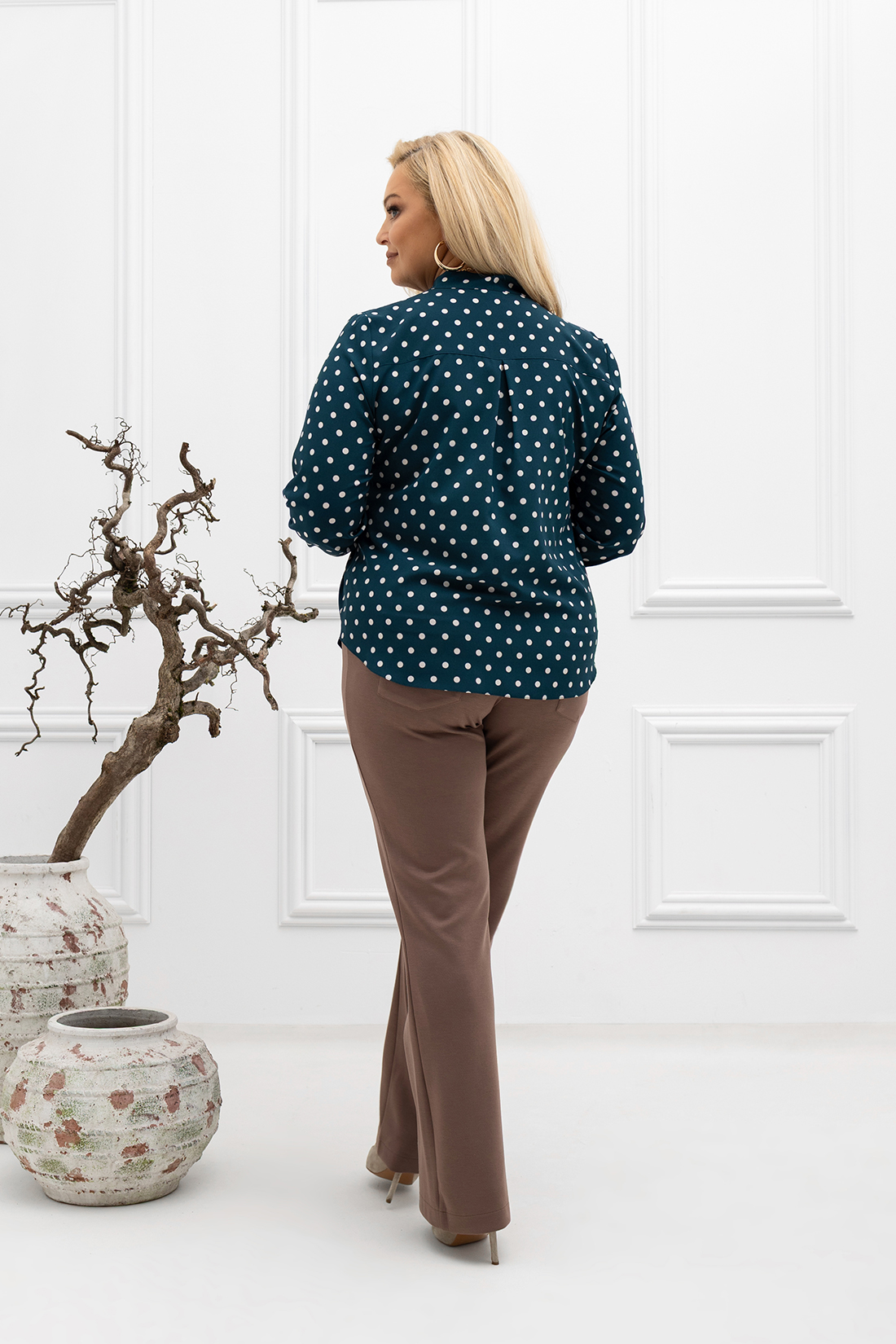 - Dół bluzki zaokrąglony dla lekkiego, swobodnego wyglądu.