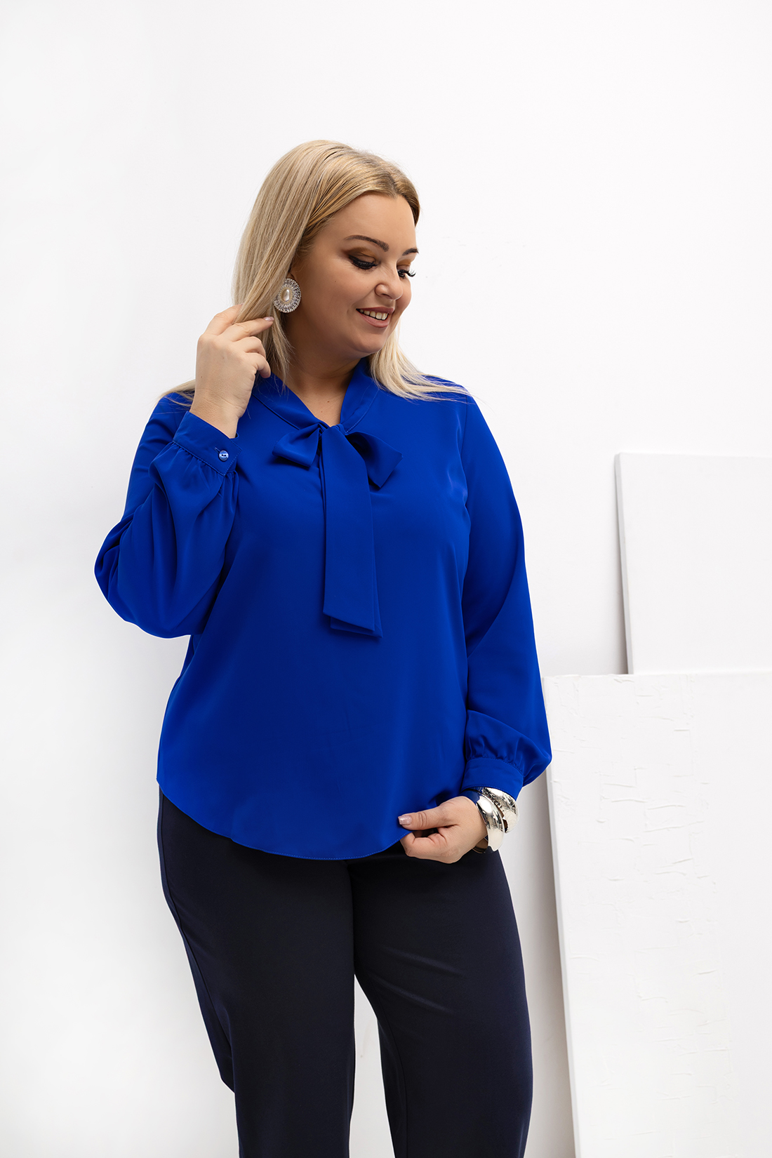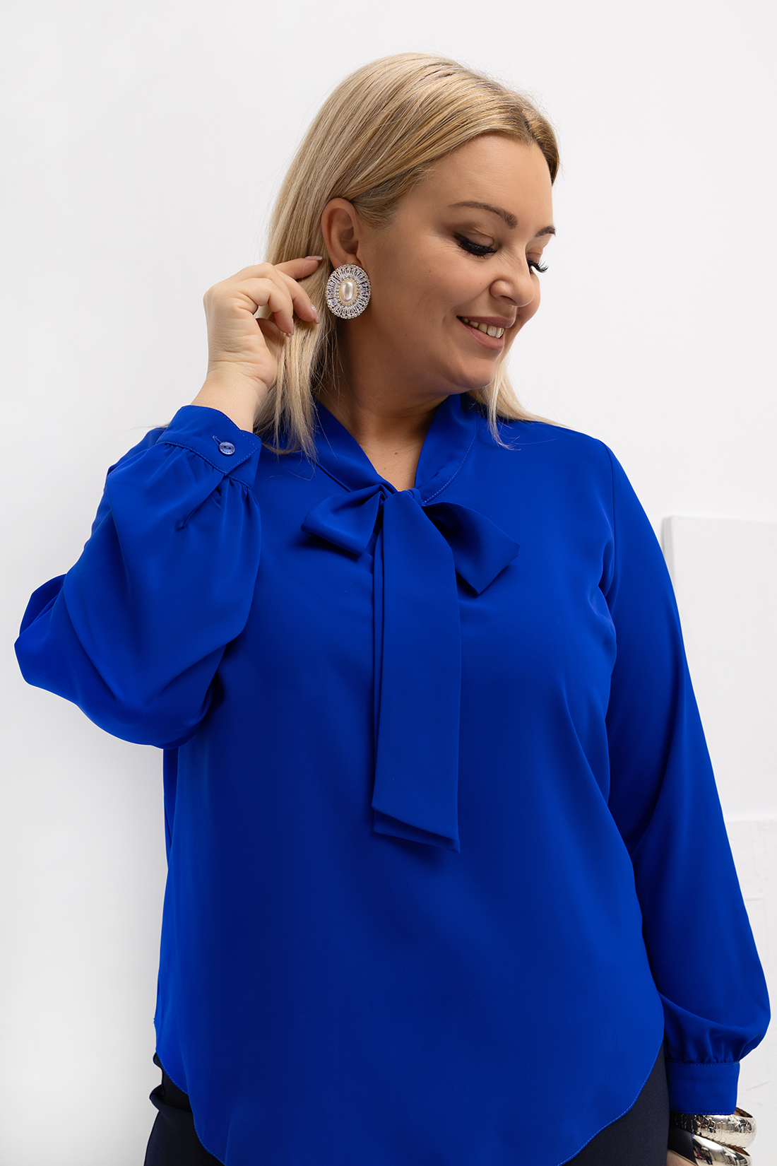 - Zapięcie: góra bluzki ozdobiona krawatką, którą można wiązać na kokardę lub luźno przewiązać w stylu krawata.
