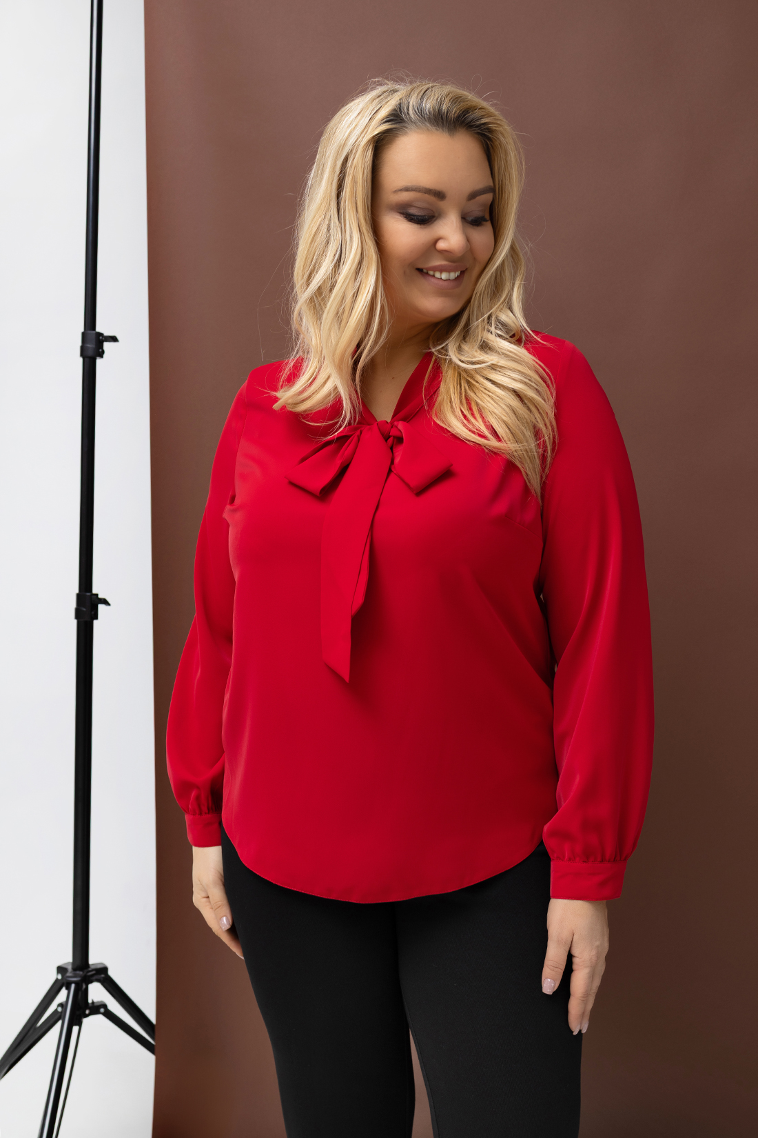 - Zapięcie: góra bluzki ozdobiona krawatką, którą można wiązać na kokardę lub luźno przewiązać w stylu krawata.