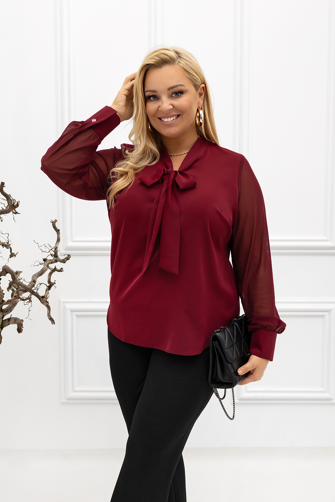 - Rękawy: Długie, wykonane z delikatnie transparentnej tkaniny siateczkowej, zakończone szerokimi mankietami z subtelnym marszczeniem i guzikiem, co dodaje bluzce lekkości i wyrafinowania.