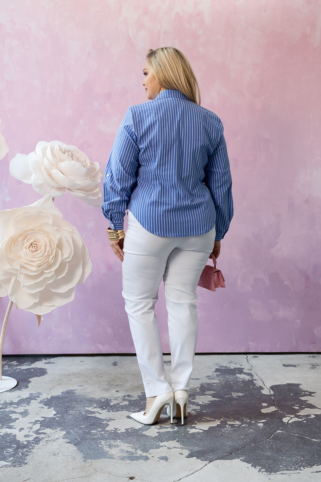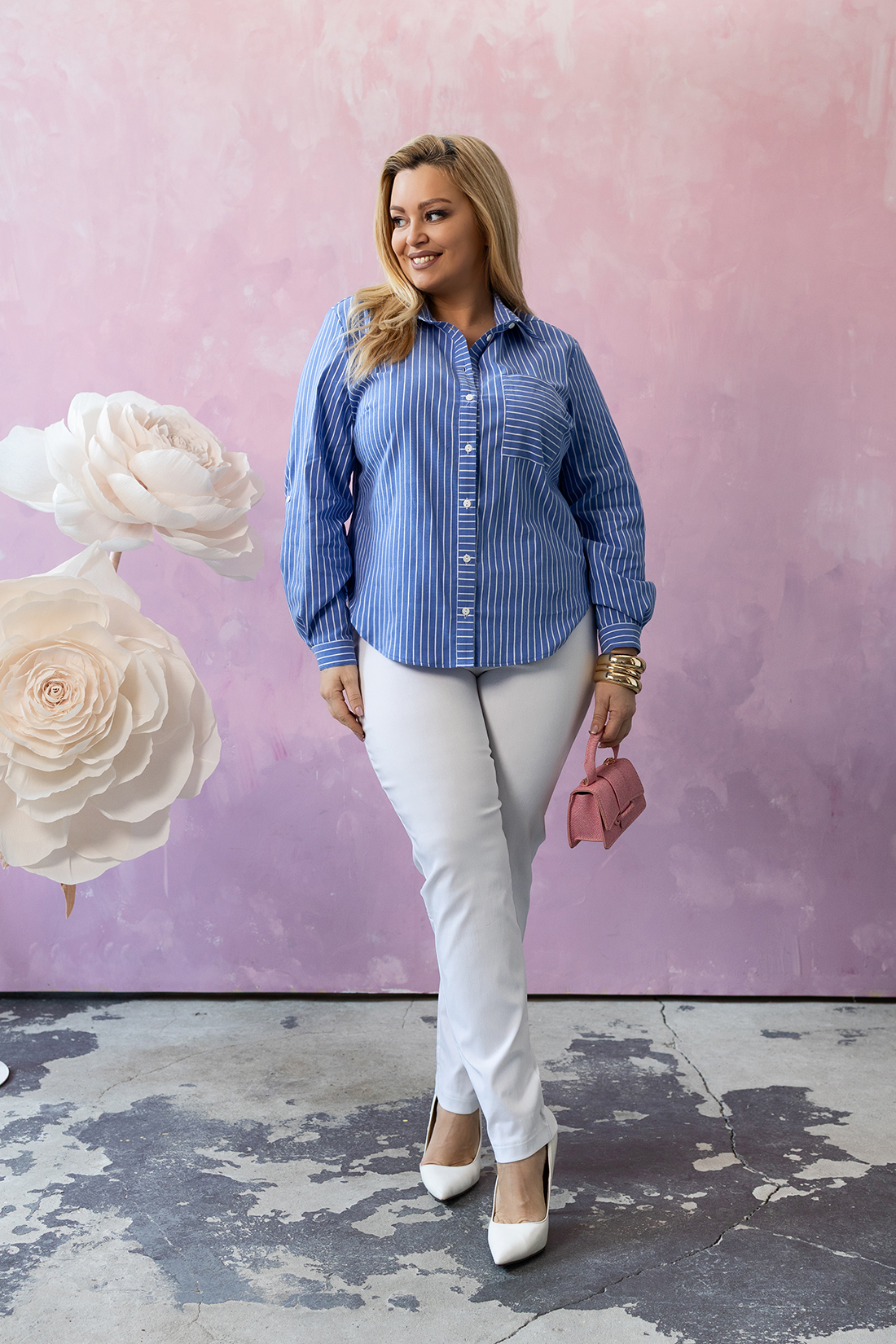 Koszula VIKTORIA w szerokie paski jeans świetnie komponuje się z eleganckimi spodniami, spódnicą ołówkową czy klasycznymi jeansami. To uniwersalna koszula damska plus size, która łączy komfort, kobiecość i ponadczasowy styl.