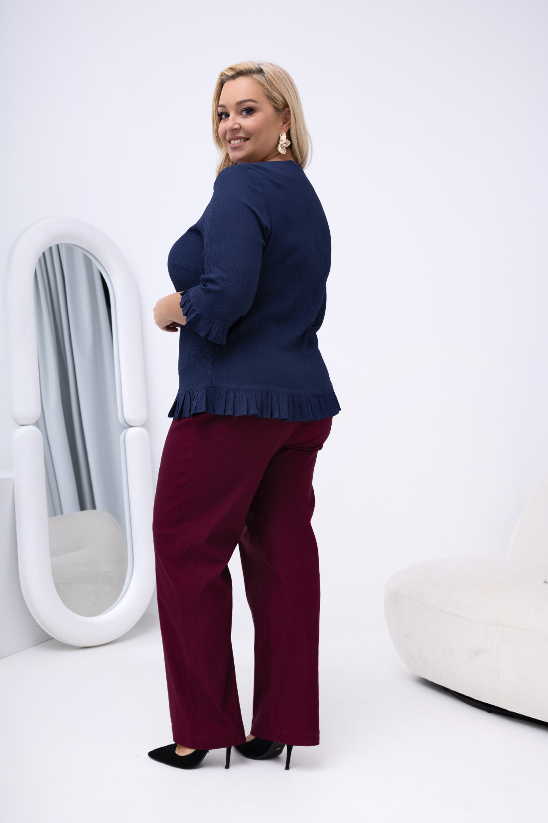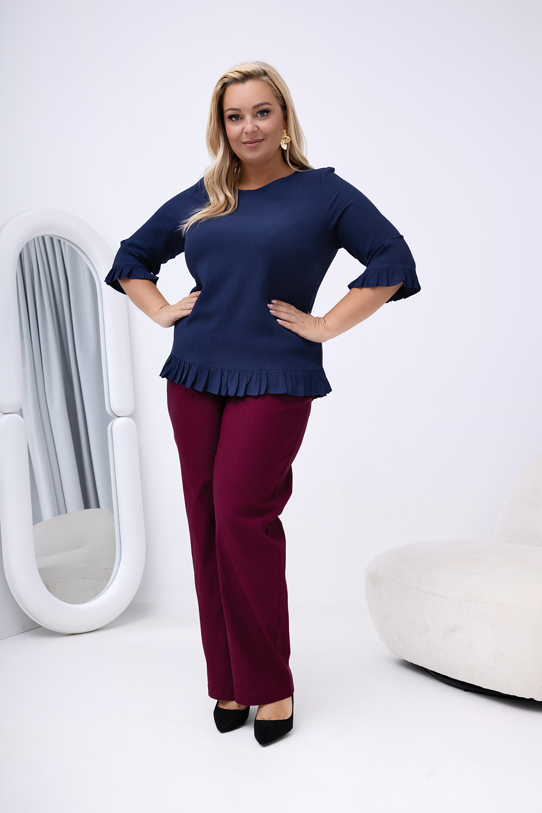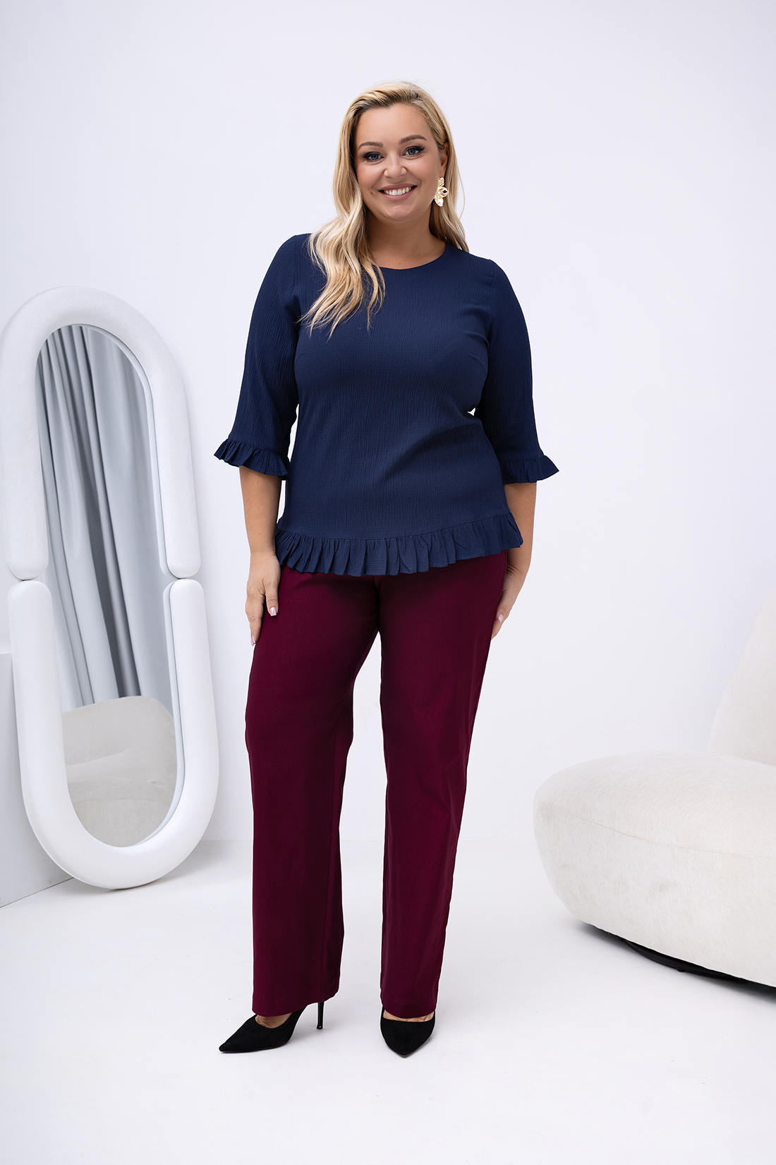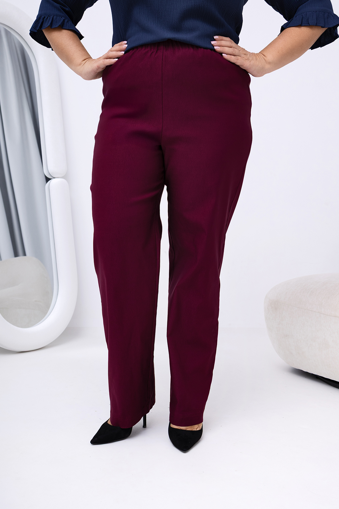 To modne spodnie plus size 42–60 od polskiego producenta odzieży damskiej. Połącz je z szeroką koszulą, elegancką bluzką lub dopasowanym topem i ciesz się ponadczasowym stylem.